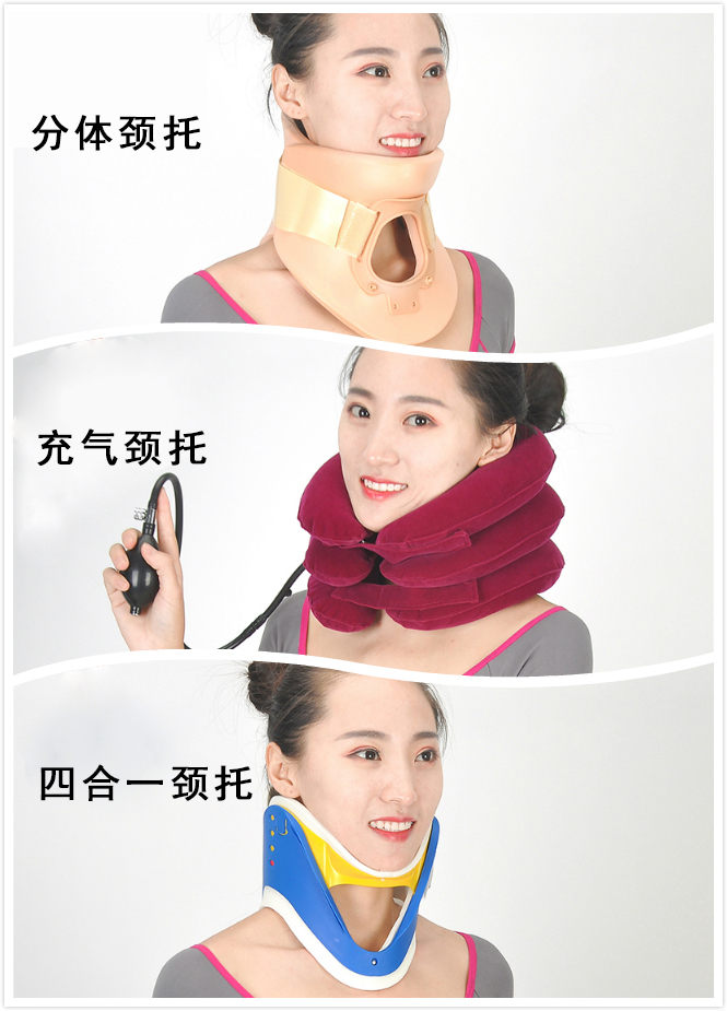 充气式颈托:是由软塑料制成,用时充气戴于颈部。另一种是由橡胶制成,犹如弹簧,用时先戴在颈部,再充气。充气量多少可根据每个人的颈部尺寸而定。因为很多人的颈部尺寸和轮廓都不相同,这种颈托则弥补了这个缺陷。