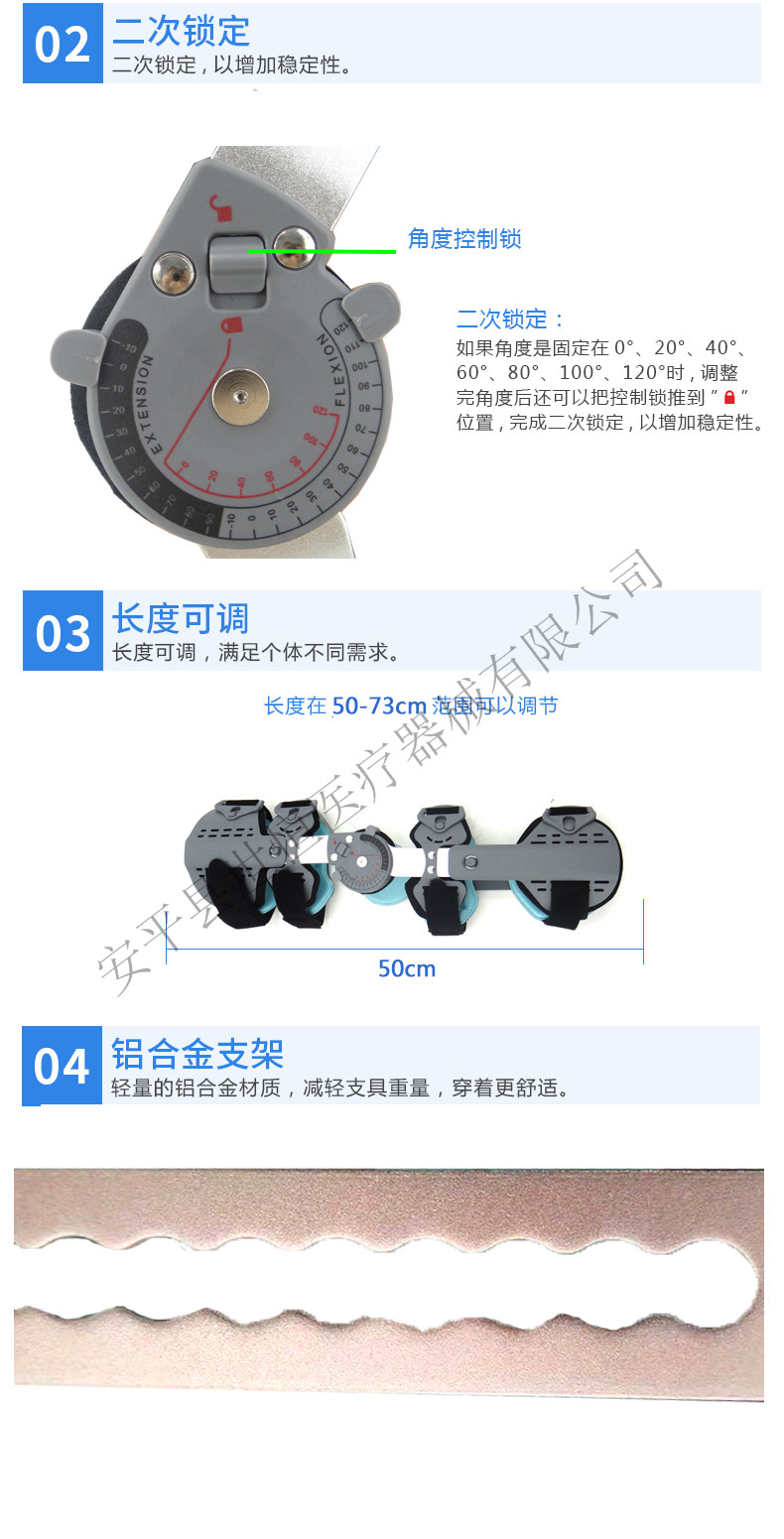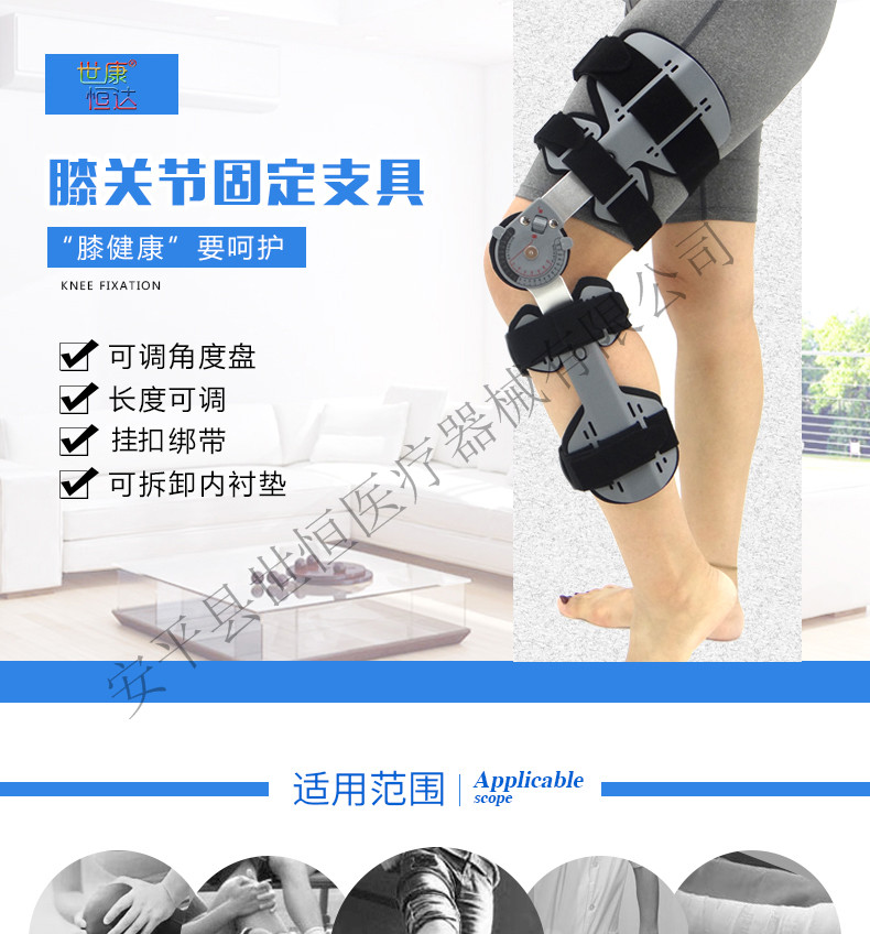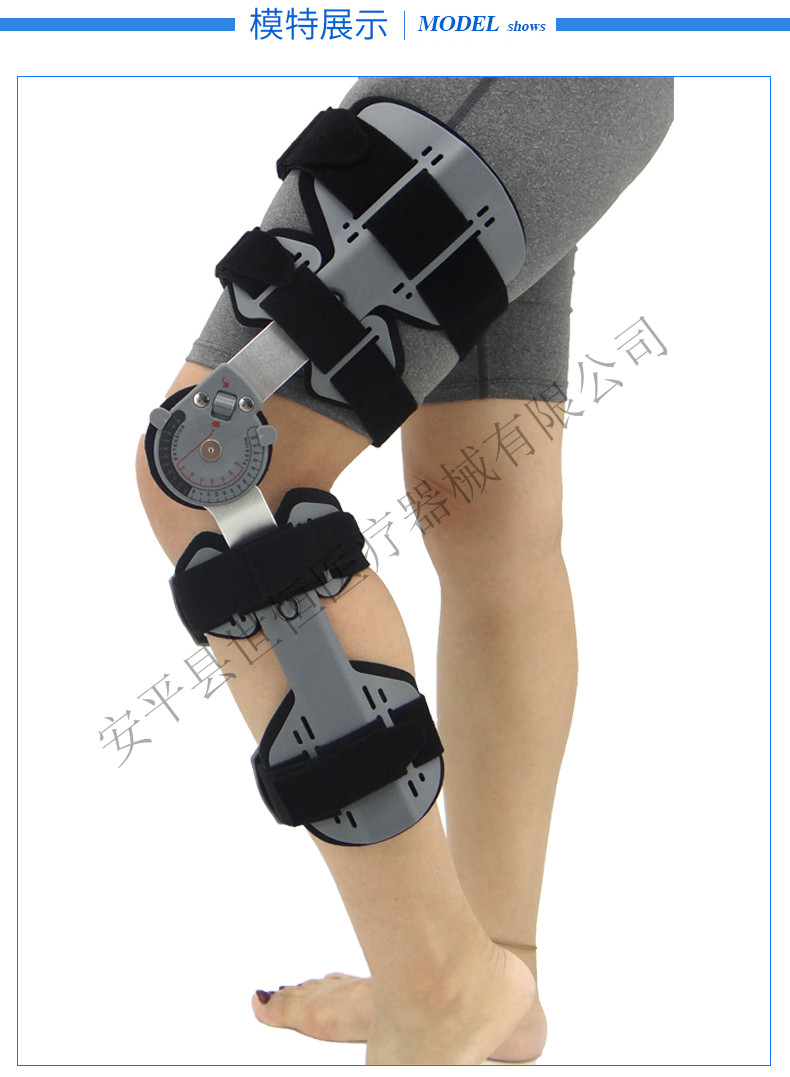 可调膝关节支具适用范围:适用于膝关节扭伤、内外侧韧带及十字韧带损伤、关节韧带松脱、膝关节挛缩、关节过伸的外固定。