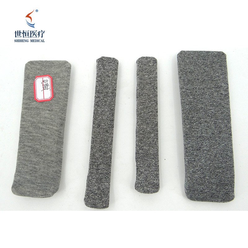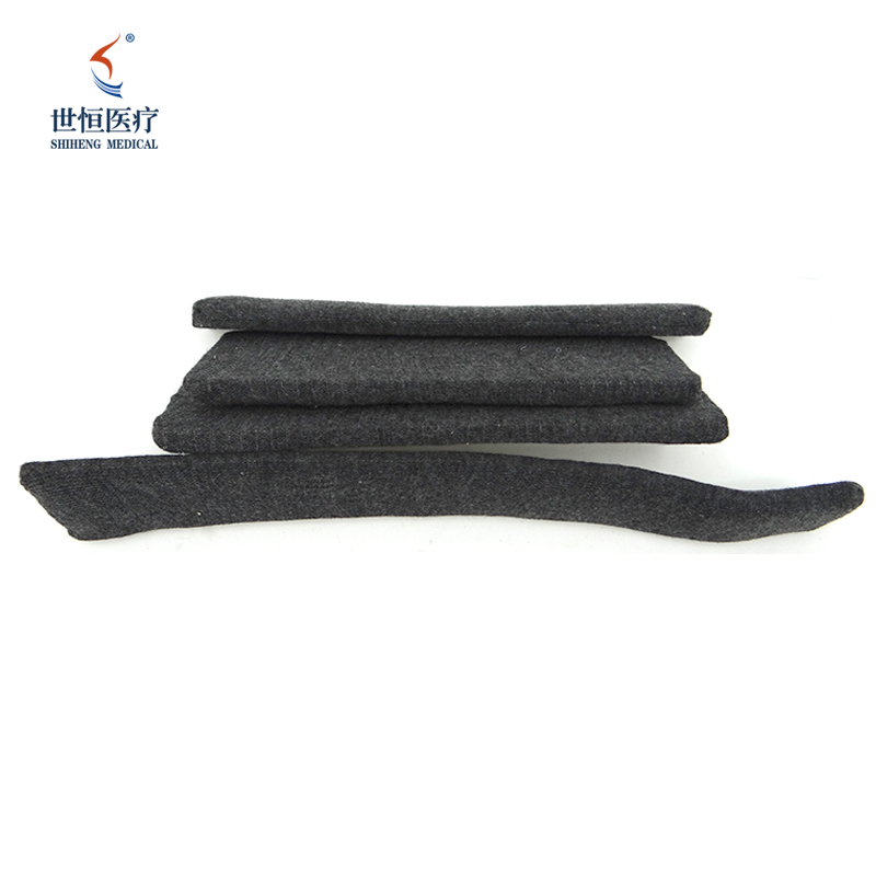 骨折固定的夹板通常至少都有4块,胫腓骨则有5块,一般都是在骨折的前后左右分别各放一块,而完全包裹骨折的肢体。如果是固定的地方出现有骨性凸起,例如是下肢的内外踝的地方,则需要用棉垫或者棉花来适当保护。把夹板放好所在的位置之后,然后至少要利用3条绑带给予固定夹板。通常在夹板的近端与远端各放一条,而中间可以放1~2条,必须要根据肢体的长度来决定。绑带的松紧程度以用一公斤的力量给予活动绑带,以能活动一厘米左右为宜。