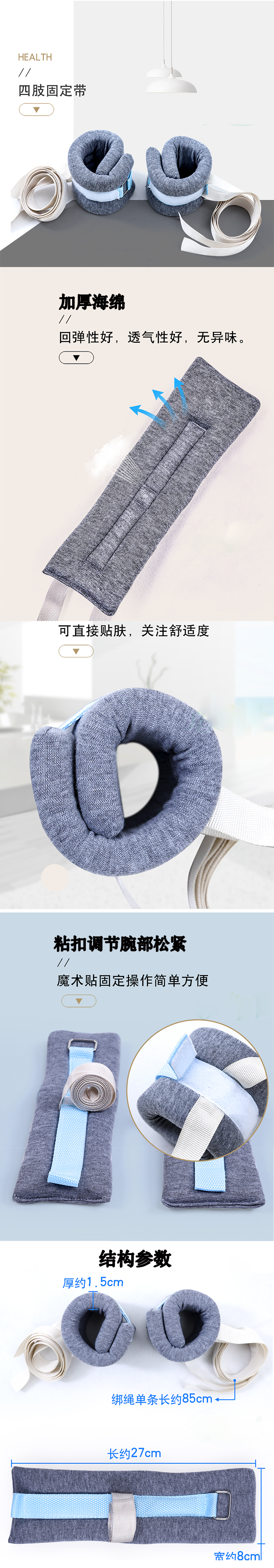 『性能特点』:约束带是一种保护病人的装置,用于躁动病人有自伤或坠床的危险,需要固定身体某一部分时,限制其身体及肢体的活动。