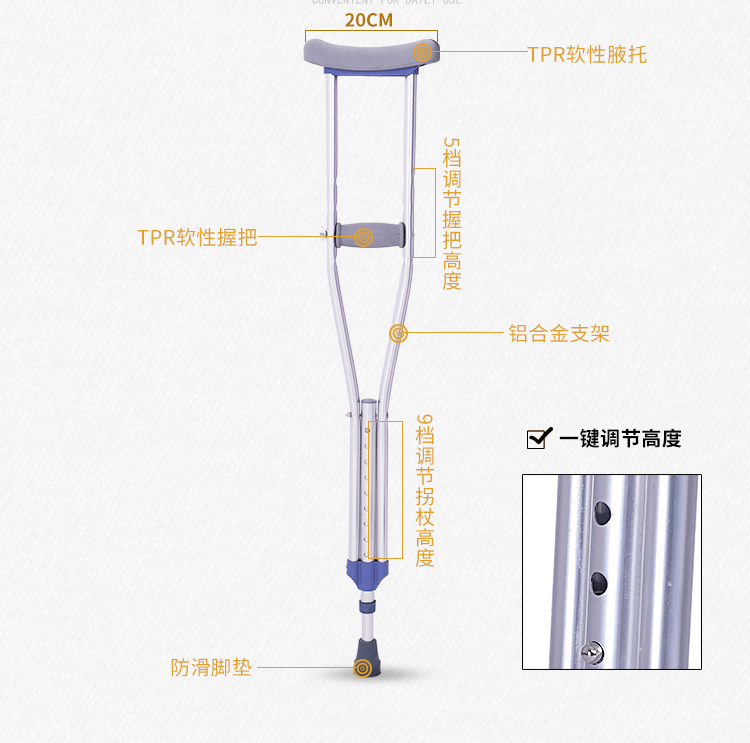 调整高度,身体直立,将拐置于小脚趾前外侧约15-500px,紧实接触地面。将拐的腋垫贴于腋下两侧的胸壁肋骨处。双手握紧扶手,用手臂的力量支撑身体(此为正确持拐姿势)。第1步出双拐,第2步向前移动重心,同时双足向前摆出至双拐落地点连线后方。此方法是开始步行时常用方法,稳定性好。