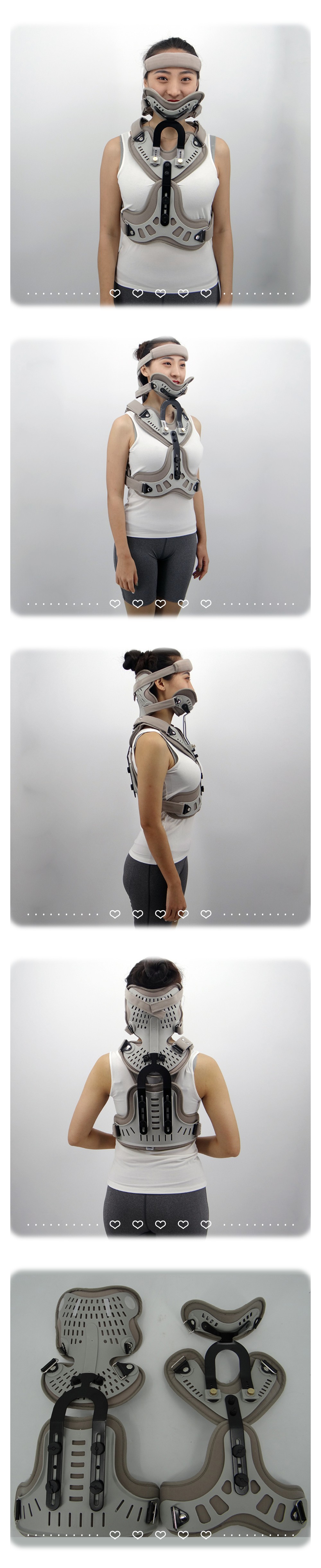 由一对前后胸片,一个可调下颚托,一个可调后枕托及内衬垫组成,用三组魔术贴连接固定。