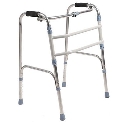 双手握紧助行器站稳,放置身前,患侧腿先迈出足跟落在助行器后腿位置,另一侧腿跟上,交替重复。