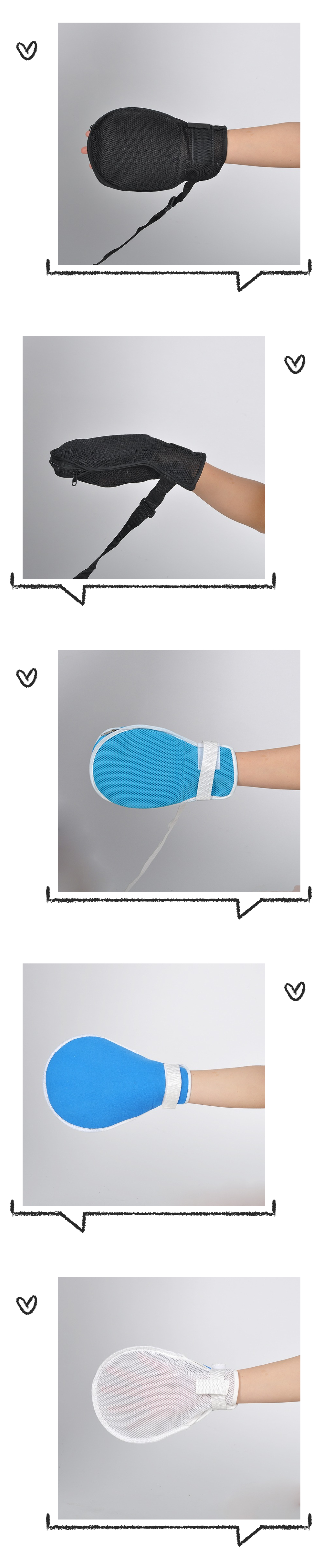 约束手套一般由入口部、手套部和固定带三部分组成。入口部外侧设有粘扣带或磁扣设计,起固定作用;手套部由透气网布制成,设有掌侧面、背侧面两层,内有塑料板。