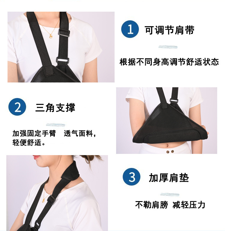 适用范围:临床上上肢骨折 (如肩关节脱位、肘关节脱位、锁骨骨折、肱骨外髁颈骨折、肱骨干骨折、前臂双骨折等)、手外伤、臂丛神经损伤、肩部或上臂外伤、肩部手术后、脑卒中偏瘫上肢其它疾病手术后的病人需行前臂悬吊。注意事项:固定前检查固定带各部位是否牢固,固定时务必牢靠;固定时间根据患者病情需要进行固定。