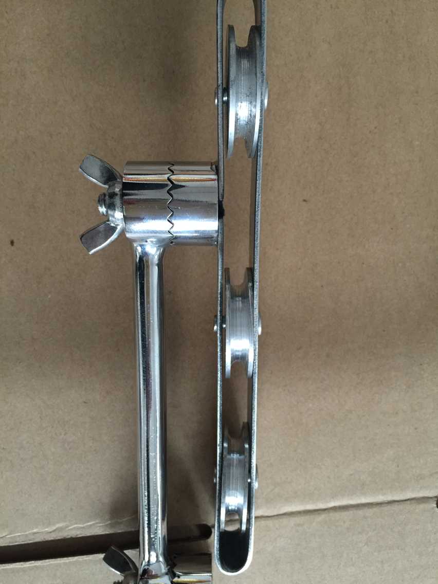 3 通过上述两个部位的高度调节 ,将滑轮调整于近乎头颅耳后线水平 ,然后根据颈椎屈曲或过伸位牵引的要求 ,再在上下方向上略作调整 ,完成高度上的调节。至于水平方向上的调节 ,因上滑槽或下滑槽均较长 ,几乎达套芯支架横杆的全长 ,因而通过“移动滑轮”部分在“套芯支架”上沿滑槽作内外方的推移 ,即可实现水平方向上的调节;