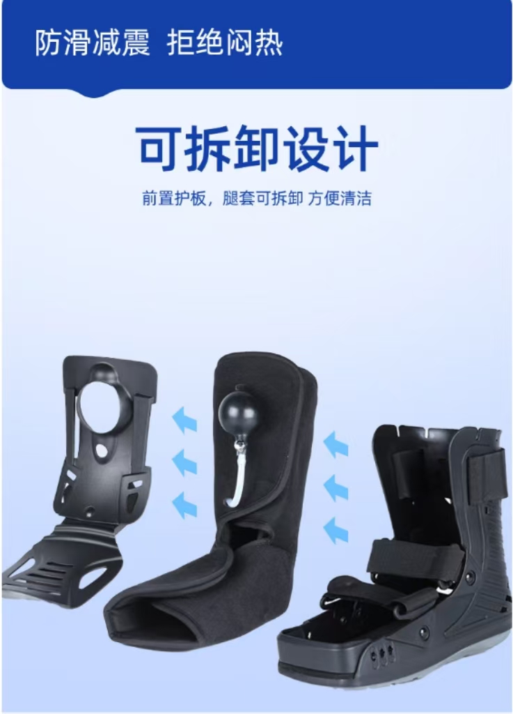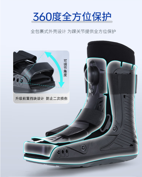 产品描述:该类产品以一体铸塑件为基础外壳,内衬复合布靴套,配置气囊和前盖,全包保护,穿戴方便,固定稳定。