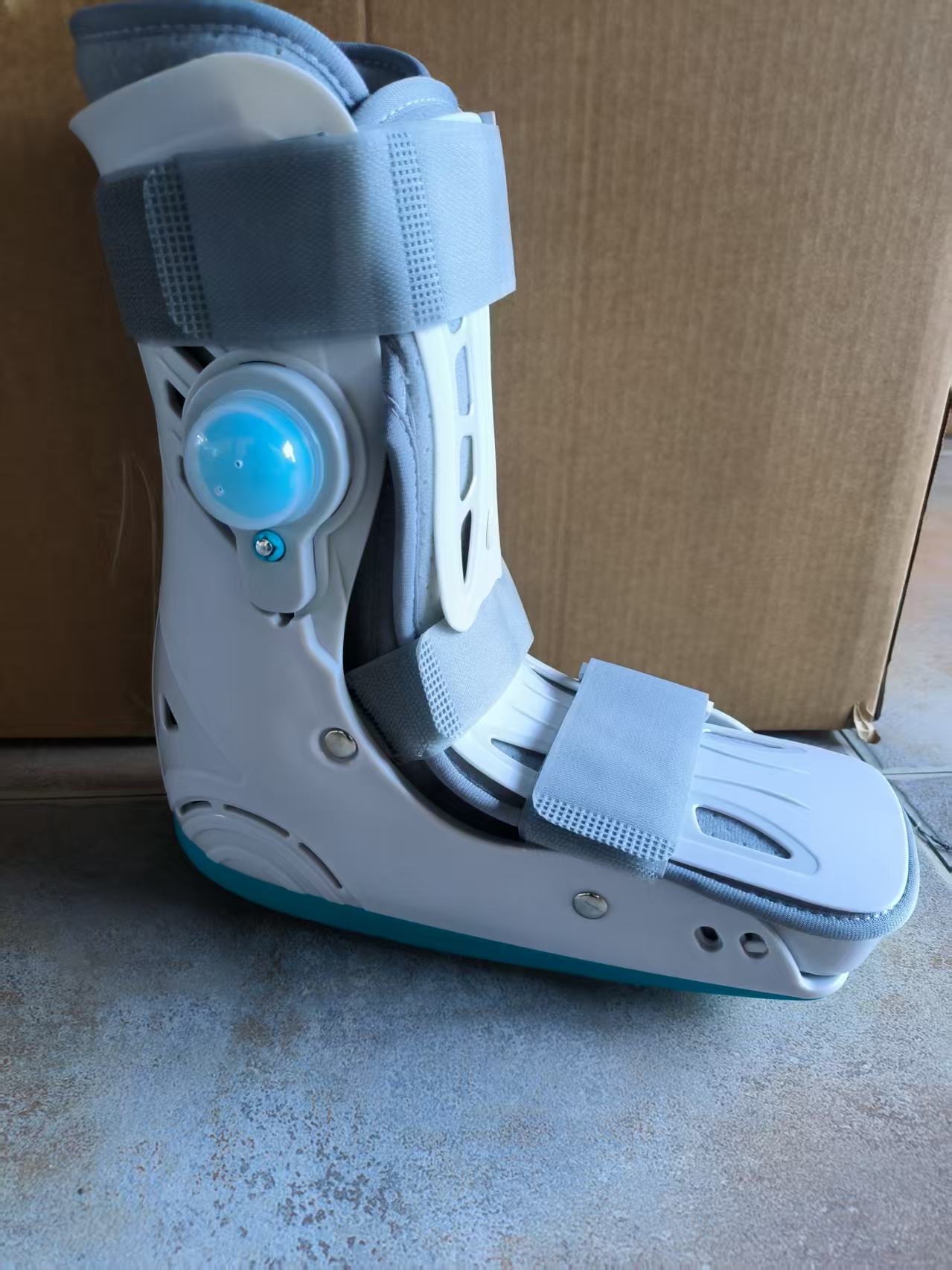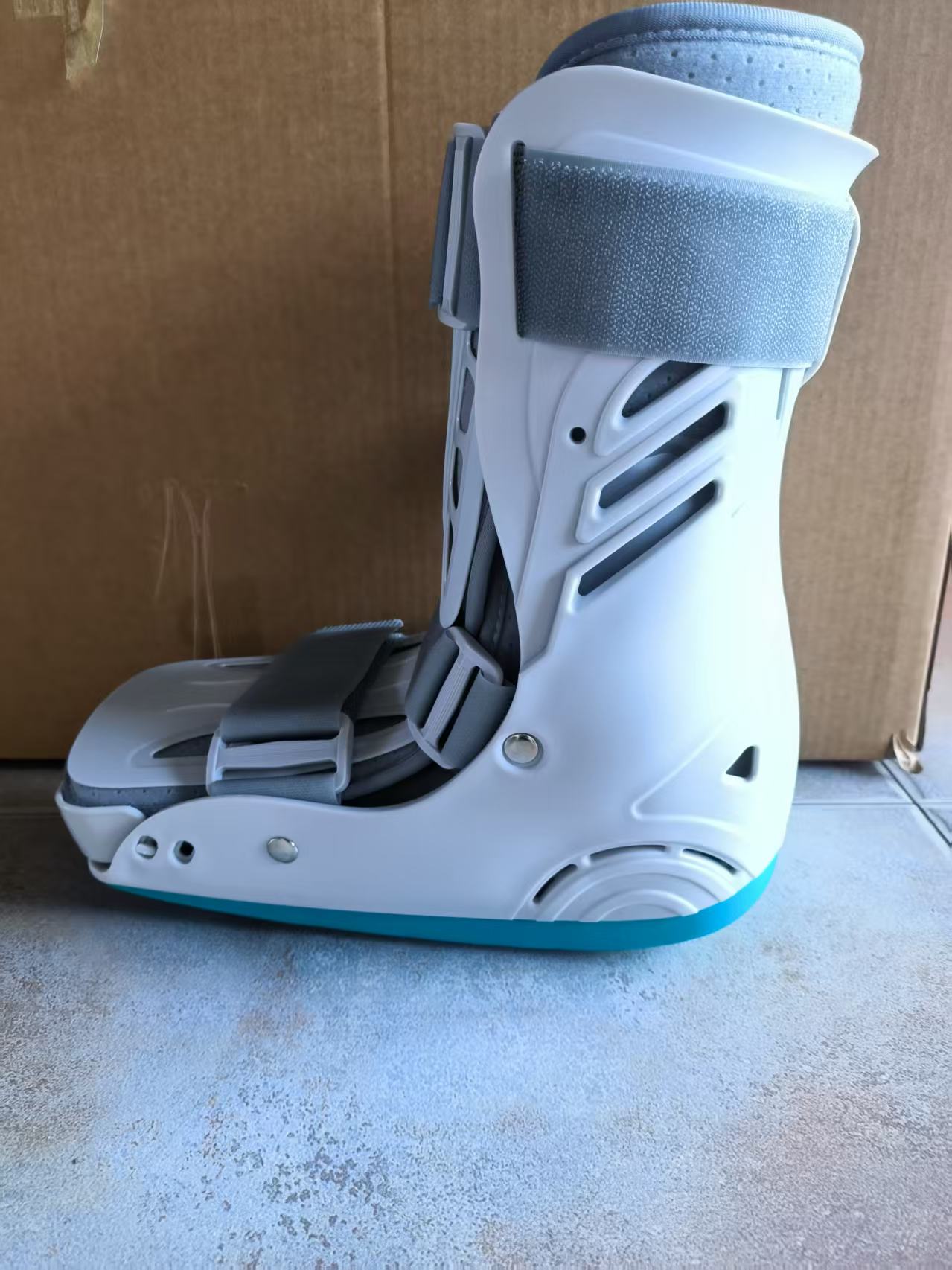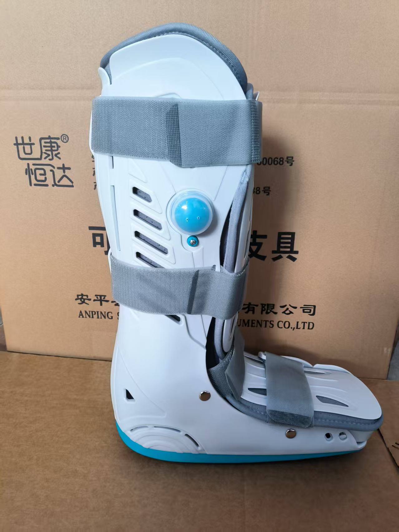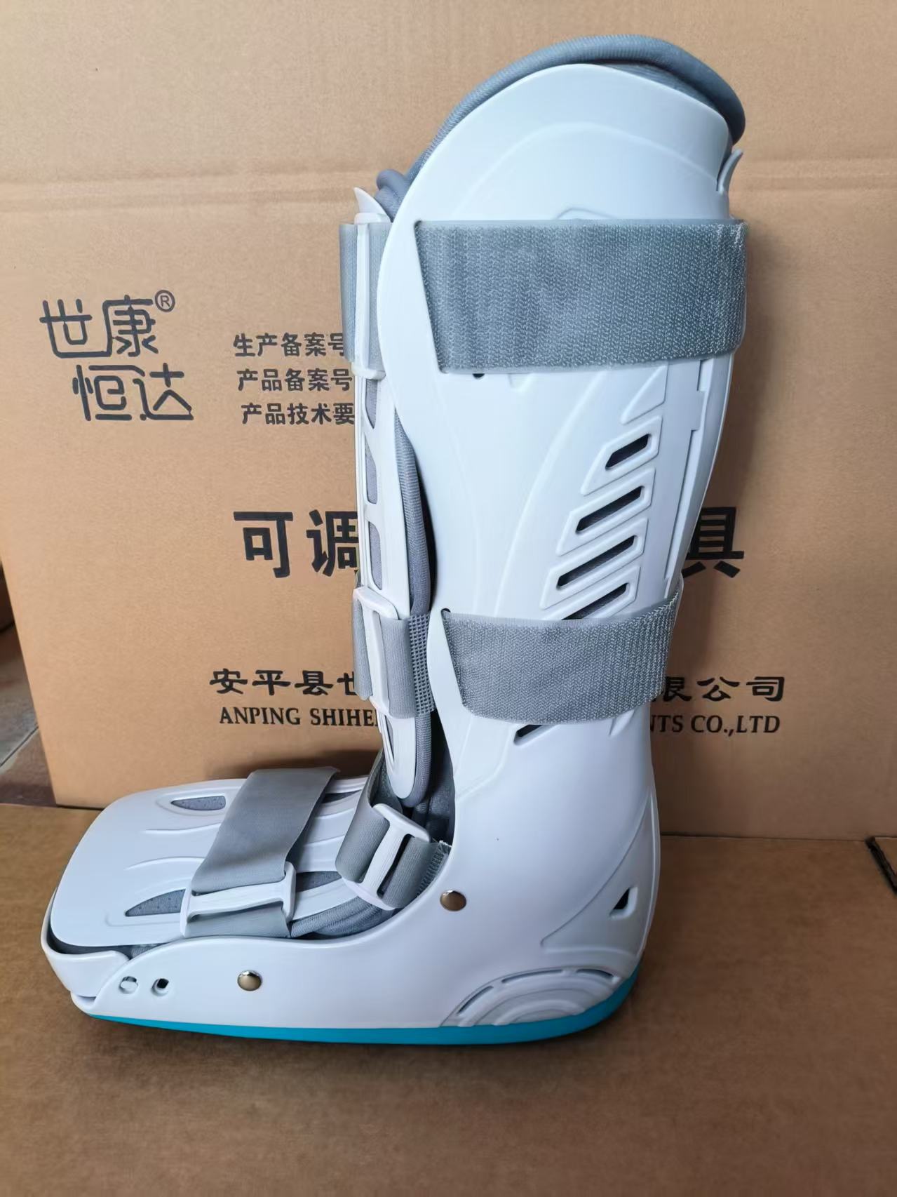 产品描述:该类产品以一体铸塑件为基础外壳,内衬复合布靴套,配置气囊和前盖,全包保护,穿戴方便,固定稳定。此款产品为高位款,配置气囊,也可选配足跟垫。适用于踝足部稳定性骨折、足踝韧带损伤及术后固定,跟腱术后固定及康复性训练。