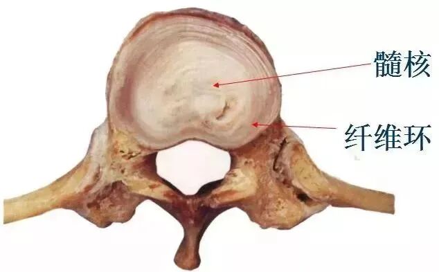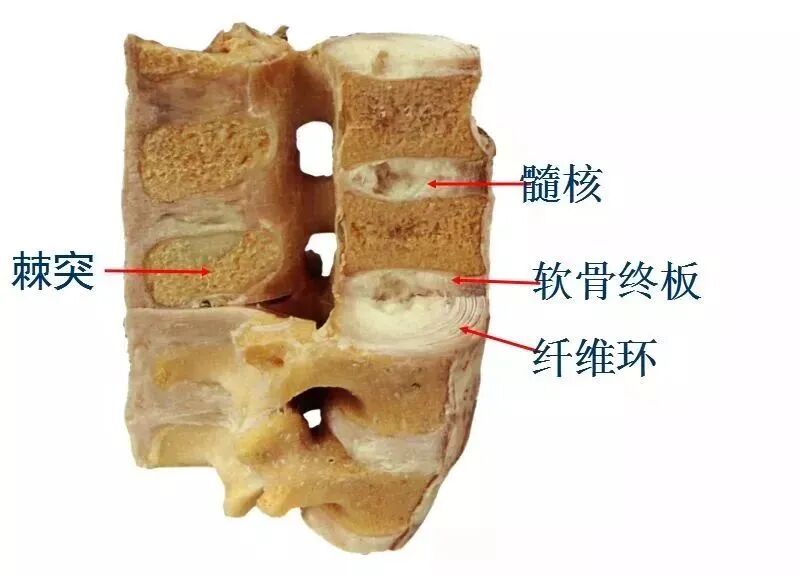 - 结构:外层是纤维环,由数十层环状及放射状的胶原纤维及弹性纤维交织而成,按同心圆排列,质地坚韧。中央是髓核,为柔软而富有弹性的白色半流质胶状物质,是胚胎发育时脊索的残余物。上下两端则是透明软骨板,覆盖在椎体上下面。