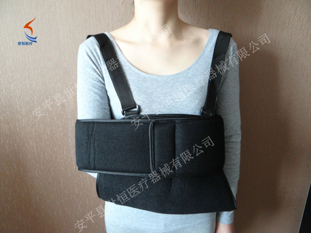 前臂吊带由合成皮革、里布、木板制成;底部木板起到了托扶作用,减轻了患者上臂的受力,经济耐用,上下可调整,使用简捷、舒适、易于固定、透气性好。