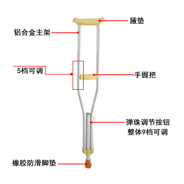 1、选择适合自己身高的腋捌;身体正直站立,双臂自然下垂,拐的横梁部分在腋下5厘米左右,扶手部分在手自然下垂正好握住的高度。腋捌的整体高度和手肤高度都是可调节的,使用前调节到适合自己的高度。