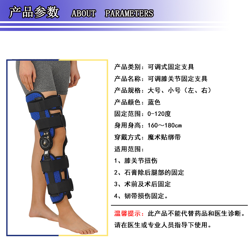 膝关节支具的作用:用于膝关节骨折固定、髌骨脱位保护、膝关节扭伤、石膏除去后的腿部固定、韧带损伤的固定等。