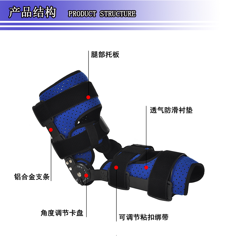 膝关节支具的组成:舒适复合布内衬、角度调节卡盘、绑带固定粘扣、铝合金支架、魔术贴绑带等。